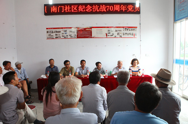 为继承发扬抗战精神,激发广大党员群众爱党、爱国热情,9月2日,板浦镇南门社区举办“纪念抗战胜利70周年”党员座谈会。会上,邀请板浦退休的老同志深情讲述了战争年代板浦人民生活的艰辛、勇敢与敌人作战的往事,希望党员同志铭记历史,不忘国耻,珍惜和平。还播放了《筑梦中国》系列宣传教育片,大家边看、边讨论,纷纷表示国强则民强,中国之所以有现在的美好,是一代代革命先烈用鲜血换来的,激励党员同志要牢记历史,奋发图强,努力在平凡的岗位上贡献自己全部的力量。